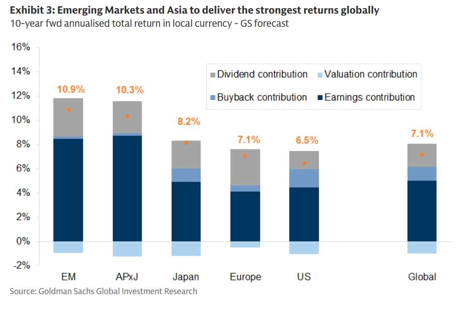 Earnings growth remains the primary engine of performance… We expect global earnings — including buybacks — to compound at roughly 6% annually. Dividends are forecast to provide the rest of the return, while Goldman Sachs Research predicts that stock valuations will ease modestly from their current highs.