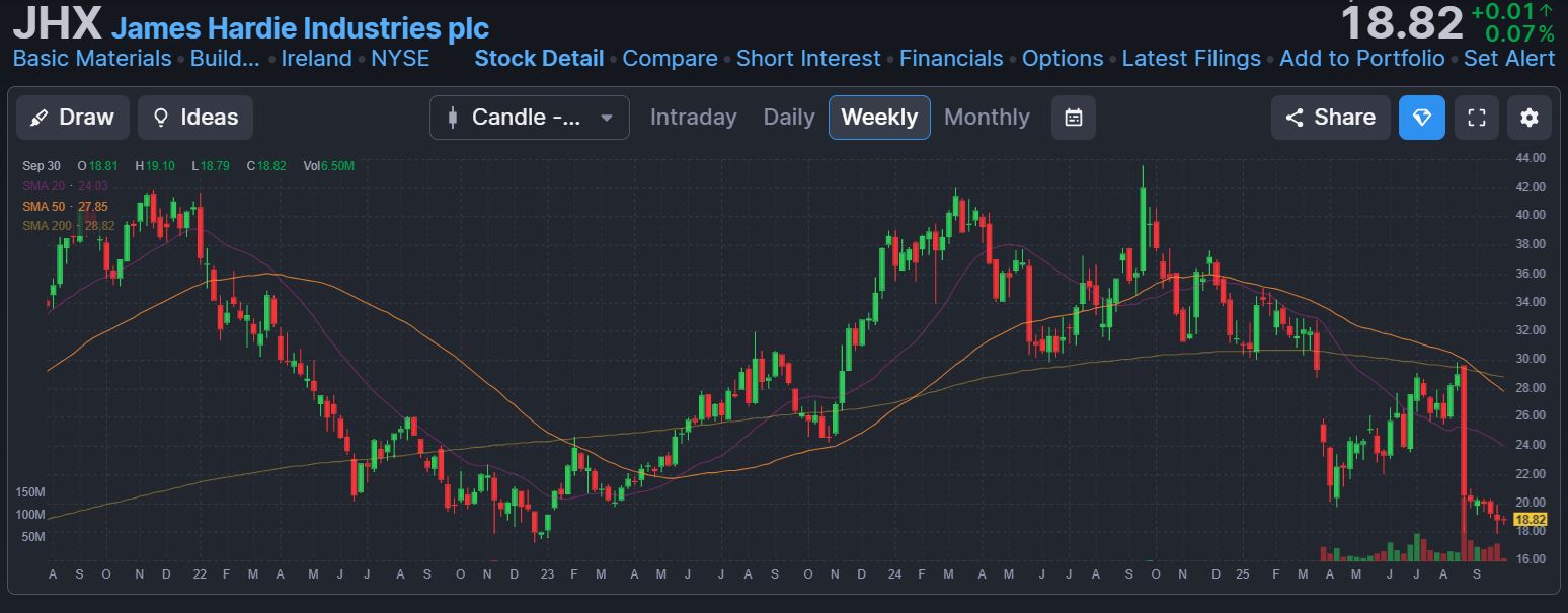 James Hardie Industries has experienced a major pullback in 2025, with shares down 38% YTD and down 50% from a year ago. It has a potentially massive technical set-up for the pure chartists who are looking for charts seeking long-term bottoms.
